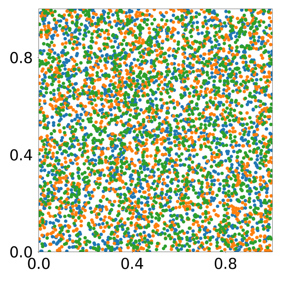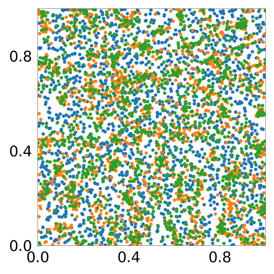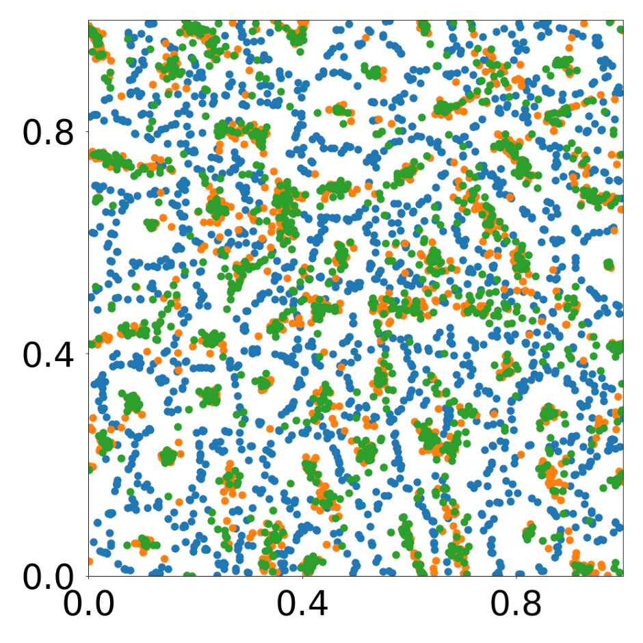 This script creates the first column of paper’s Figure 2. Simulation of an attraction-repulsion system, 4800 particles, 3 particle types.