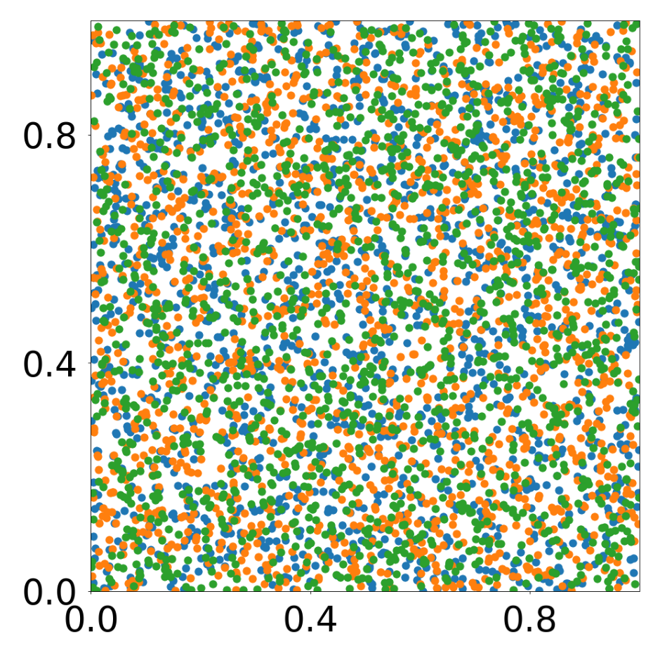 This script creates the first column of paper’s Figure 3. A GNN learns the motion rules of an attraction-repulsion system. The simulation used to train the GNN consists of 4800 particles of three different types. The particles interact with each other according to three different attraction-repulsion laws.