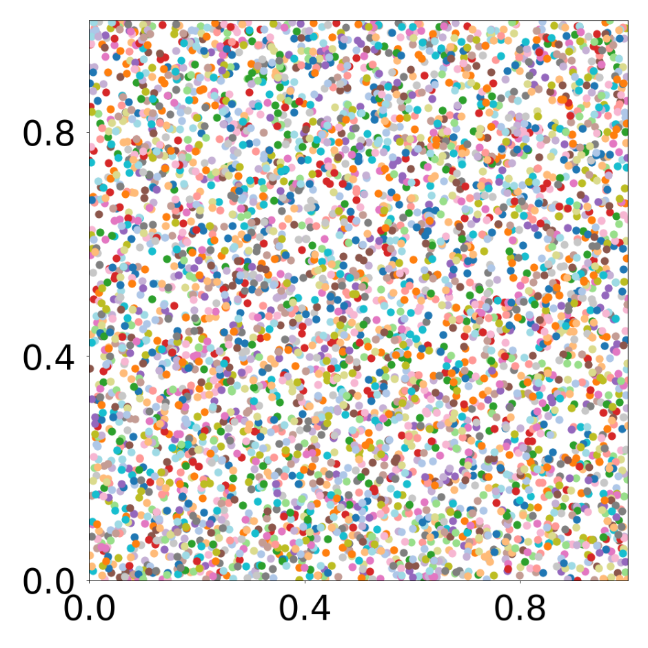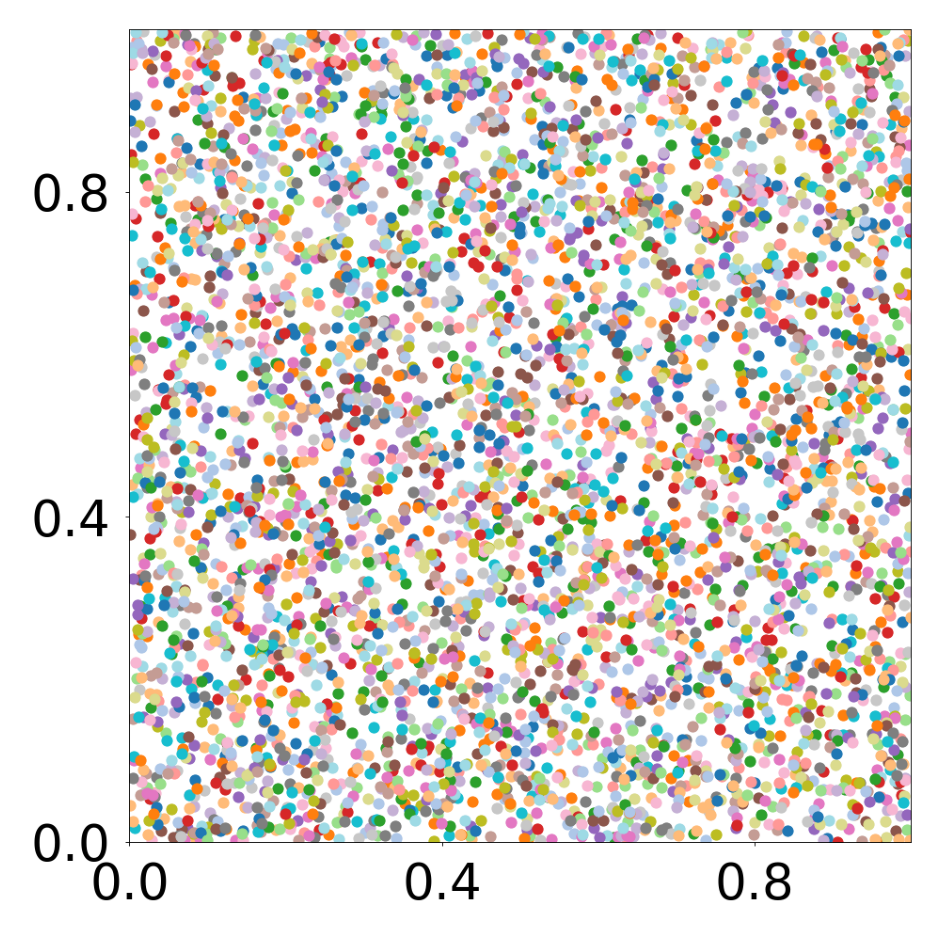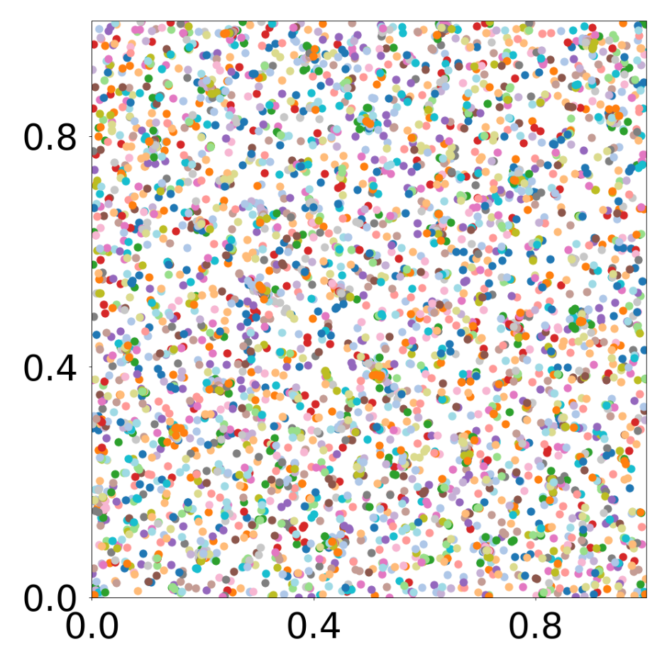 This script creates the sixth column of paper’s Figure 3. A GNN learns the motion rules of an attraction-repulsion system. The simulation used to train the GNN consists of 4800 particles of 64 different types. The particles interact with each other according to three different attraction-repulsion laws.