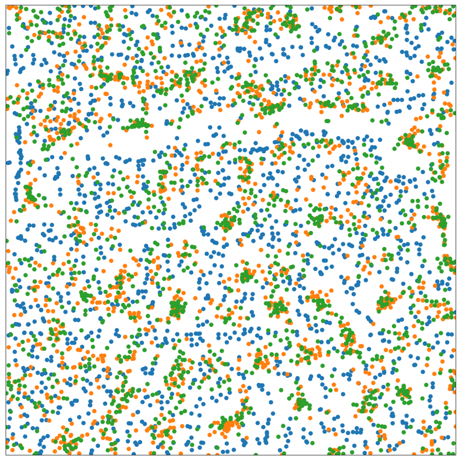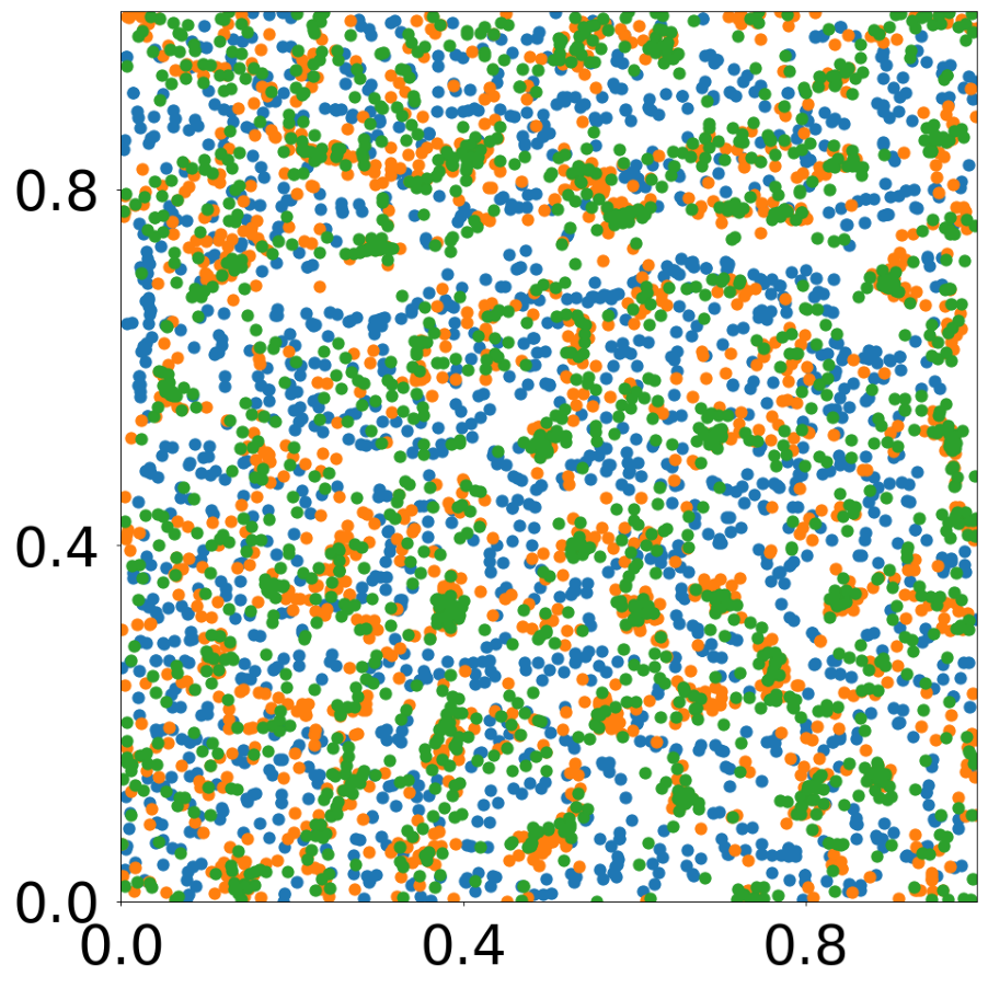 This script creates figure of paper’s Figure 4. A GNN learns the motion rules of an attraction-repulsion system. The simulation used to train the GNN consists of 4800 particles of three different types. The particles interact with each other according to three different attraction-repulsion laws. The particle interact also with a hidden dynamical field.