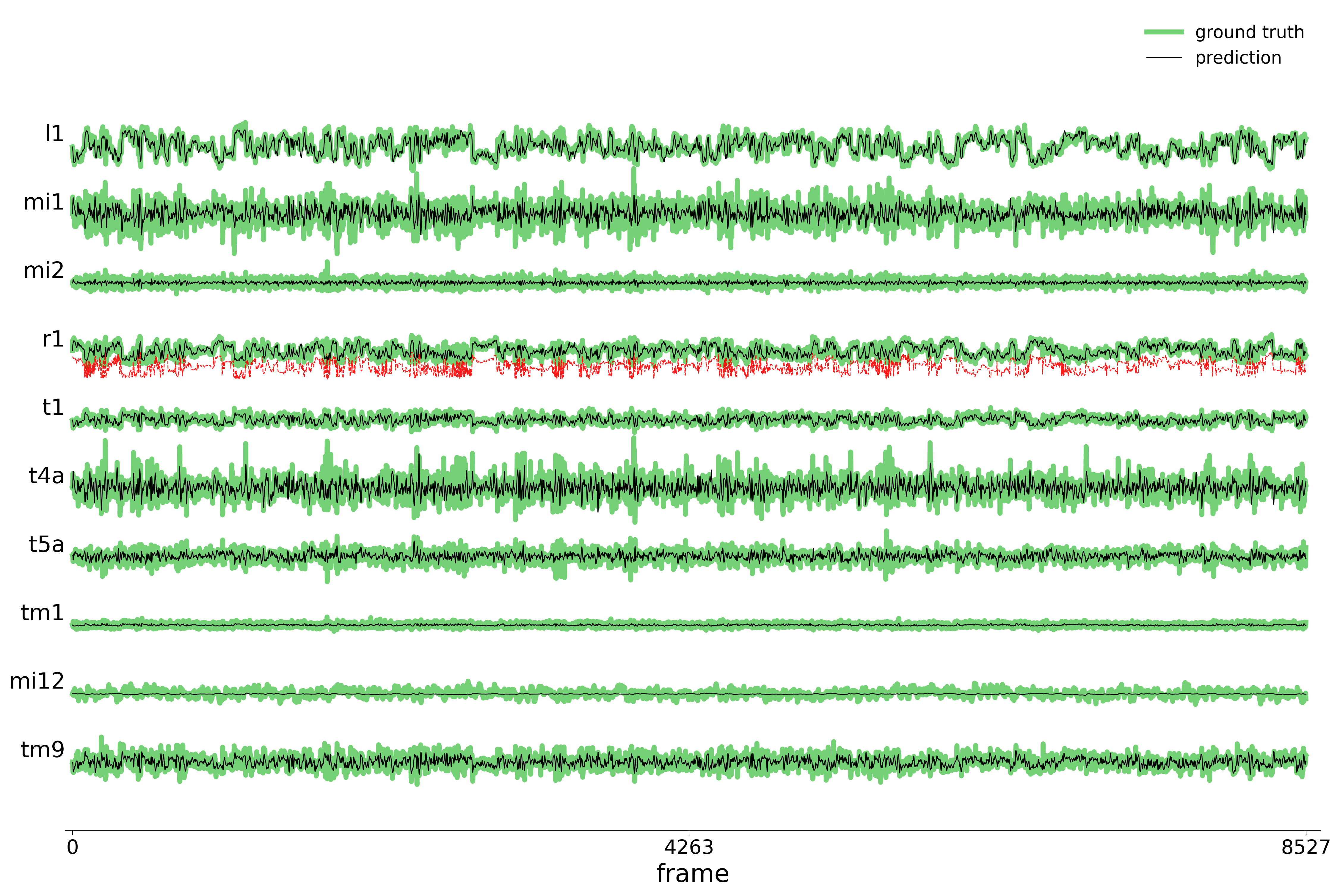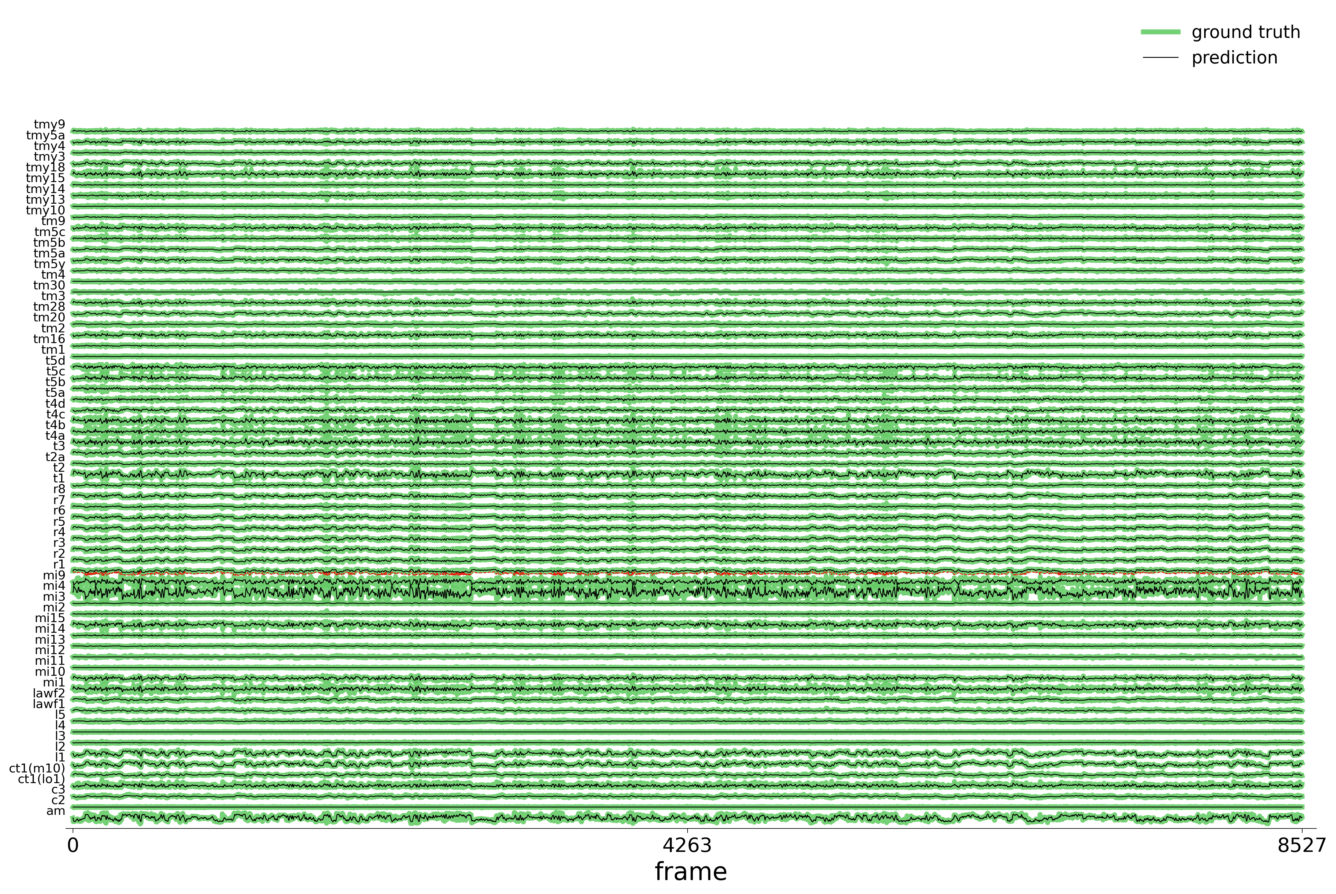 Right: rolling voltage traces for selected neurons (ground truth in green, prediction in black).