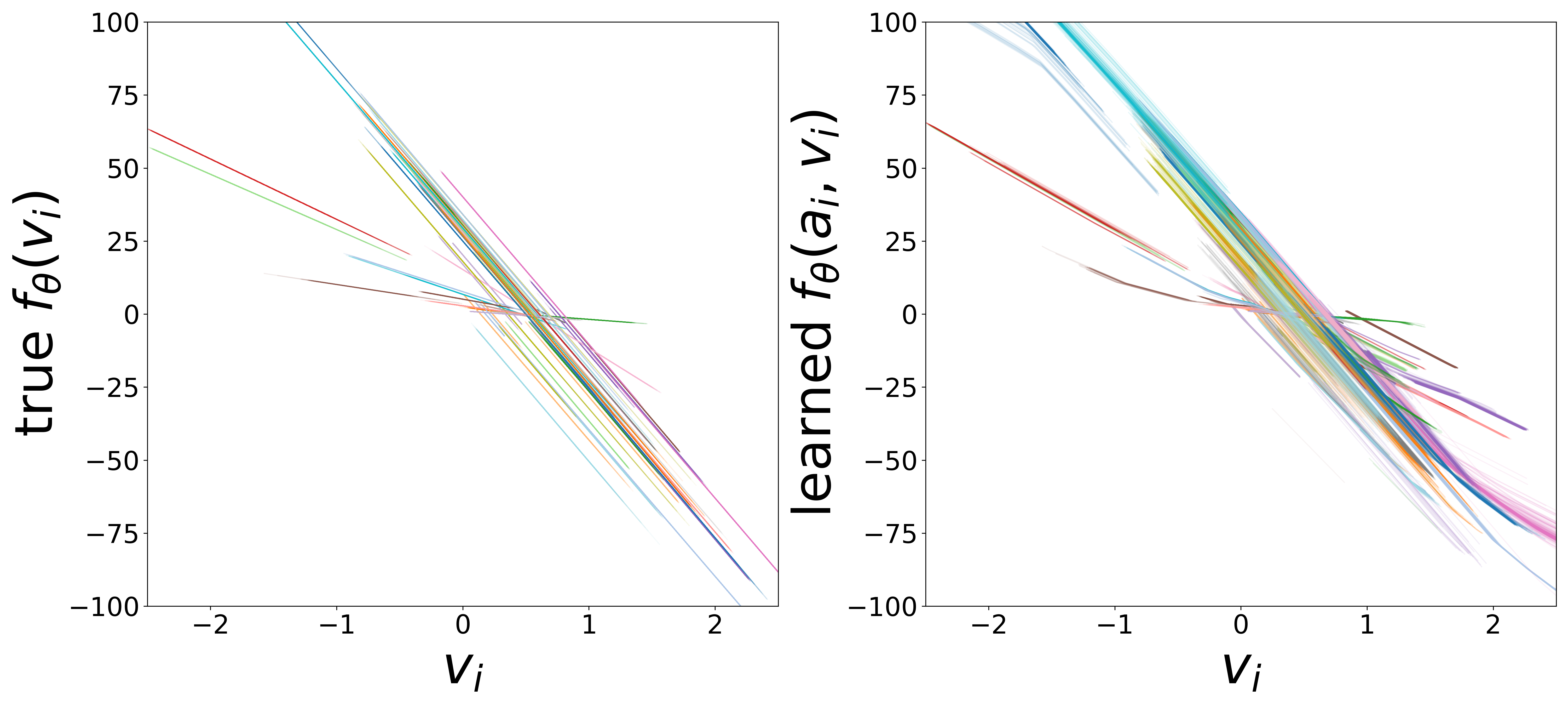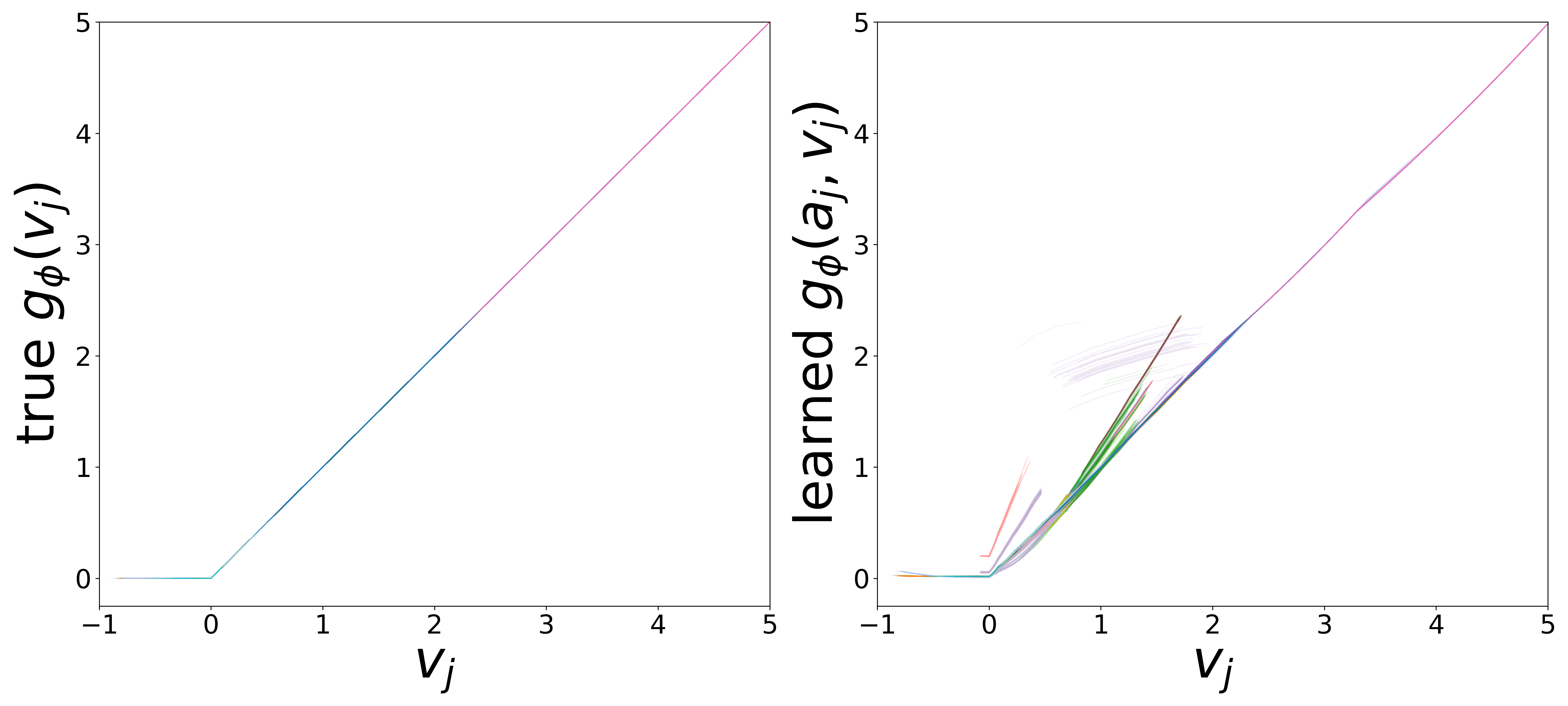 The SIREN output enters the GNN through \(f_\theta\), which receives the concatenated input \([v_i,\, \mathbf{a}_i,\, \text{msg}_i,\, I_i(t)]\). This creates an inherent scale/offset degeneracy: \(f_\theta\)’s biases absorb any constant offset, and its weights on the excitation dimension compensate any scale factor (including sign inversion). The SIREN and \(f_\theta\) jointly optimize along a degenerate manifold where the stimulus pattern is learned correctly but the linear mapping between SIREN output and true stimulus is unidentifiable. We therefore apply a global linear fit\(I^{\text{true}} = a \cdot I^{\text{pred}} + b\) and report the corrected \(R^2\).