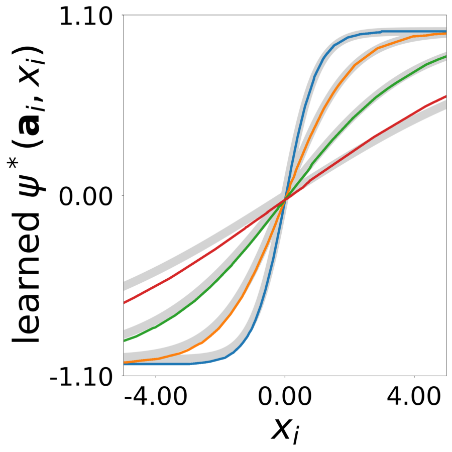 Supp. Fig 15h: : Learned transfer function \(\psi^*(x)\), normalized to a maximum value of 1. True functions are overlaid in light gray.